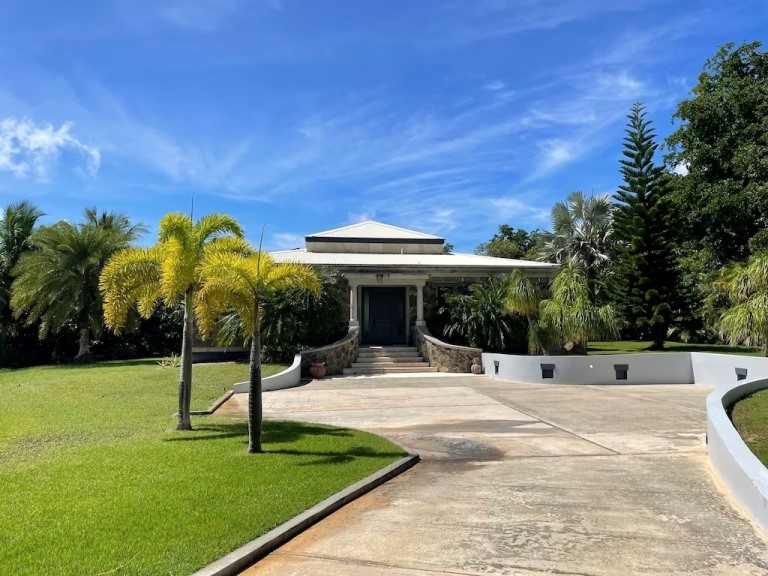 The upstairs/downstairs layout provides two separate and spacious communal living areas with a large deck, making this home perfect for families with children, or separate groups of couples wishing some ‘private space.’ The raised deck pool, surrounded by beautiful native stone and coral walls and an array of colorful bougainvillea, allamanda flowers, hibiscus and palm trees, provides a relaxing and quiet way to pass a day, for those who just don’t want to venture out some days.